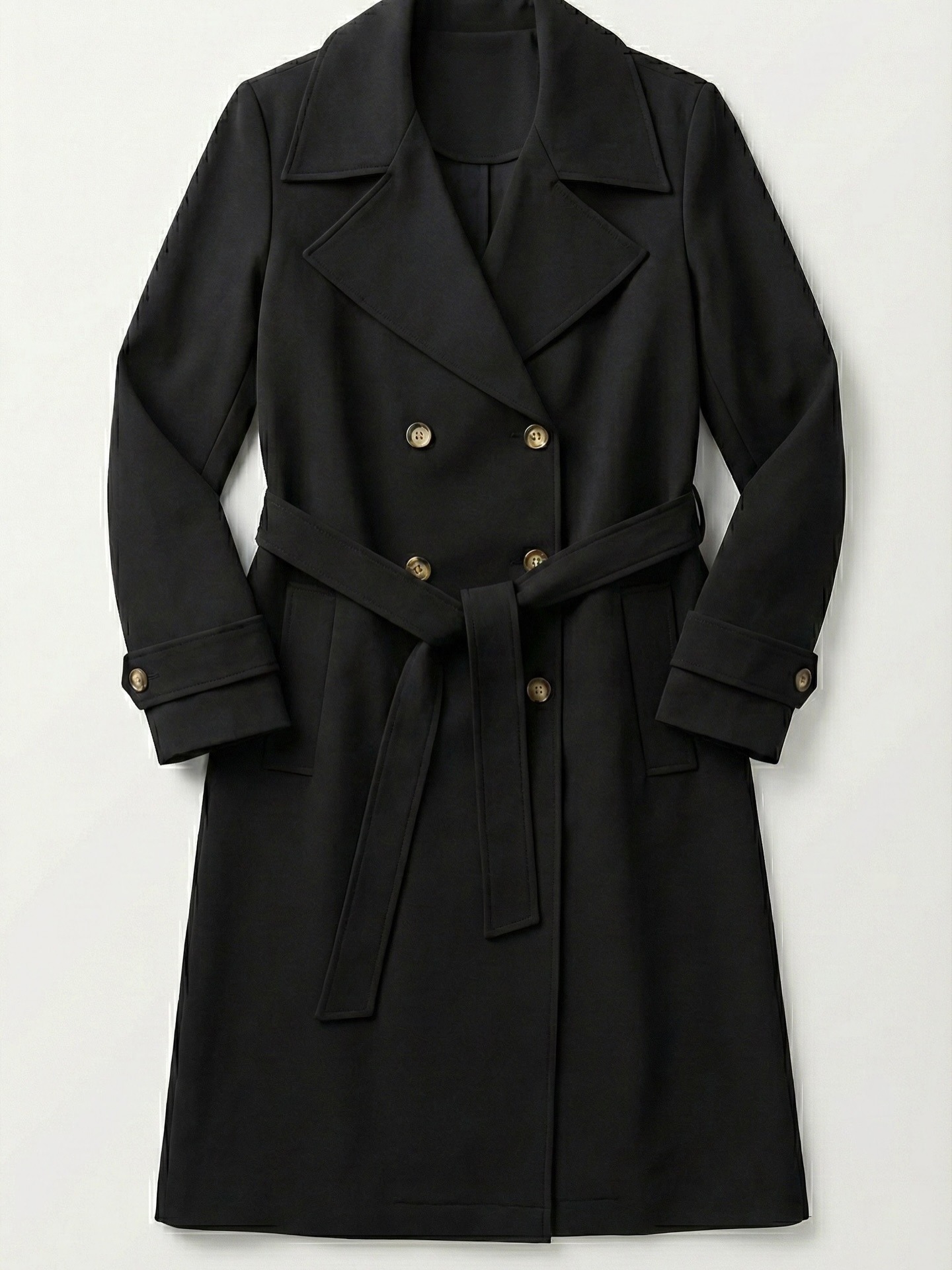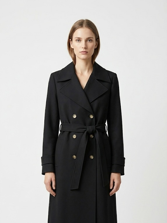 The Bagatelle Double-Breasted Trench Coat is a timeless winter essential designed for women who appreciate classic tailoring with a modern edge. Crafted in an elegant black finish, this coat features wide lapels, gold-tone buttons, and a cinched waist belt that creates a flattering, structured silhouette.
