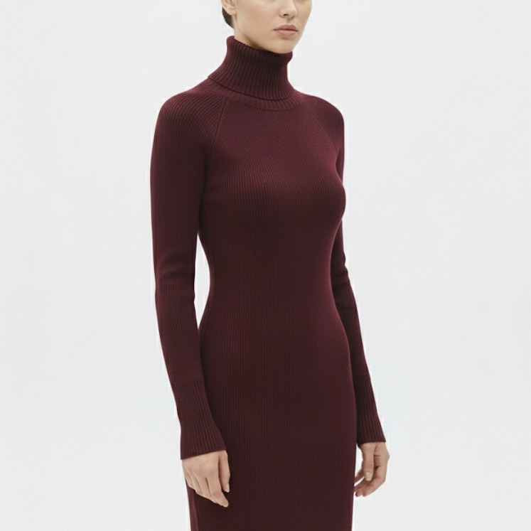Featuring a high turtleneck, long sleeves, and a sleek fitted cut, this dress is perfect for both daytime styling and evening occasions. The rich burgundy color adds depth and sophistication, making it a standout choice for winter dinners, casual outings, or chic office looks.